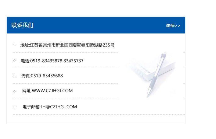 地址:常州市新北區友邦商務大廈1幢16、17層  電話:0519-85101652  傳真:0519-85112595  郵編:213022  網址:www.cz-jiayue_cn.sxxhat.com  郵箱:xiajifengaa@163.com